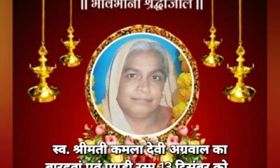 सक्ती, नगर के प्रतिष्ठित अग्रवाल परिवार की वरिष्ठ सदस्य स्व. श्रीमती कमला देवी अग्रवाल का आकस्मिक निधन 2 दिसंबर 2024 को उनके भतीजे स्व. हनुमान प्रसाद...