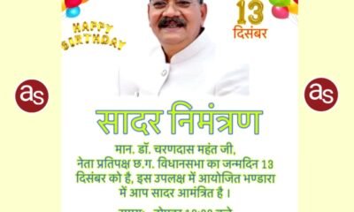 सक्ती, छत्तीसगढ़ विधानसभा में नेता प्रतिपक्ष और सक्ती विधानसभा क्षेत्र के विधायक डॉ चरणदास महंत 13 दिसंबर को अपना जन्मदिन कार्यकर्ताओं और जनता के बीच मनाएंगे।...