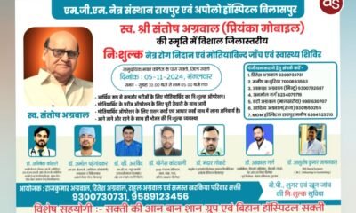 विशेषज्ञ डॉक्टरों की टीम द्वारा चिकित्सा परामर्श और उपचार .. सक्ती, स्व. संतोष अग्रवाल (प्रियंका मोबाइल) की स्मृति में आगामी 5 नवंबर 2024 को विशाल जिलास्तरीय...