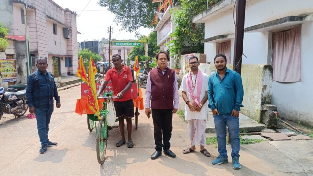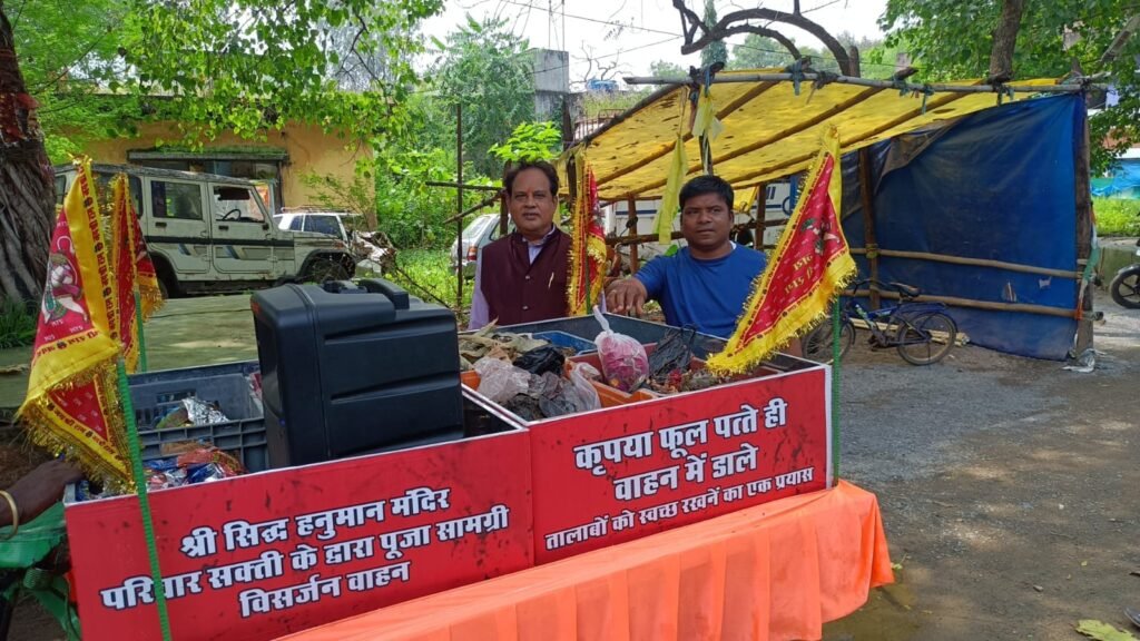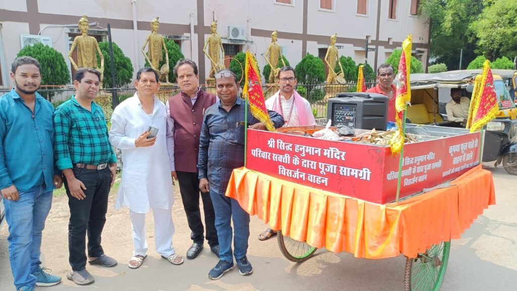 इसी तारतम्य में आज प्रधानमंत्री के आह्वान पर श्री सिद्ध हनुमान मंदिर परिवार के पुजारी ओम वैष्णव, कोंडके मौर्य, अमित तंबोली, सोनू देवांगन, अरविंद देवांगन आदि ने अधिवक्ता चितरंजय पटेल के अगुवाई में नगर के विभिन्न हिस्सों में निर्माल्य वाहन के साथ हर घरहर द्वार पहुंच अपशिष्ट पूजन सामग्री का संग्रहण कर निर्माल्य वाहन के माध्यम से विशेष गड्ढे में एकत्रित किया जहां पर उससे खाद बनेगा। इस संबंध में अधिवक्ता चितरंजय ने बताया कि इससे जल स्त्रोत तालाब, नदी नालों आदि में गंदगी फैलने से रुकेगी तो वहीं उसको सड़ा कर ऑर्गेनिक खाद भी बनाया जाएगा जो पौधों के लिए बहु उपयोगी है।