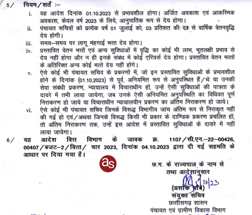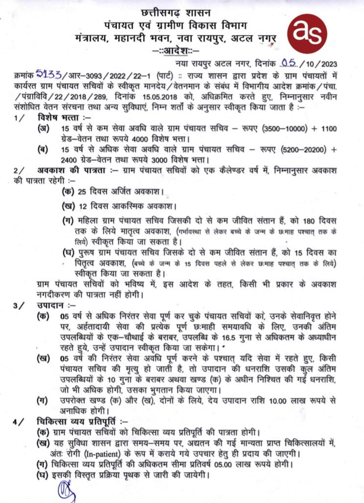 रायपुर, पंचायत एवं ग्रामीण विकास विभाग द्वारा ग्राम पंचायत सचिवों के संशोधित वेतन संरचना और अन्य सुविधाओं की स्वीकृति आदेश जारी।