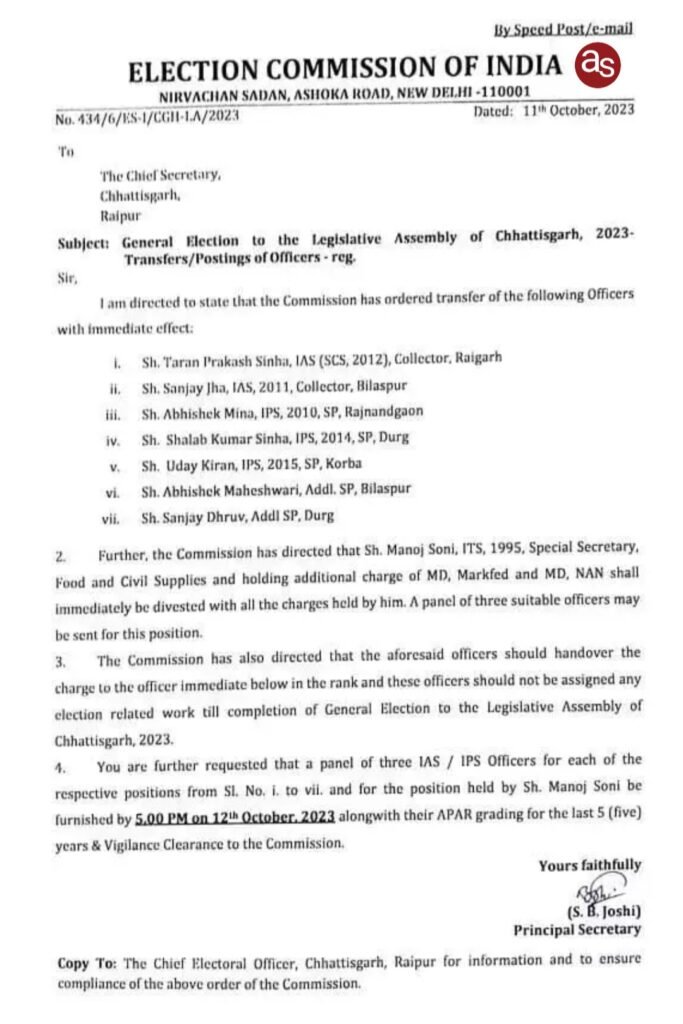 रायपुर, निर्वाचन आयोग ने बुधवार शाम छत्तीसगढ़ के 2 कलेक्टर, 3 पुलिस अधीक्षकों और मंत्रालय के विशेष सचिव मनोज सोनी को उनके पद से हटा दिया है। मनोज सोनी खाद्य विभाग में पदस्थ थे। इनके अलावा हटाए जाने वाले अफसरों में बिलासपुर कलेक्टर संजीव झा और रायगढ़ कलेक्टर तारन प्रकाश सिन्हा शामिल हैं।