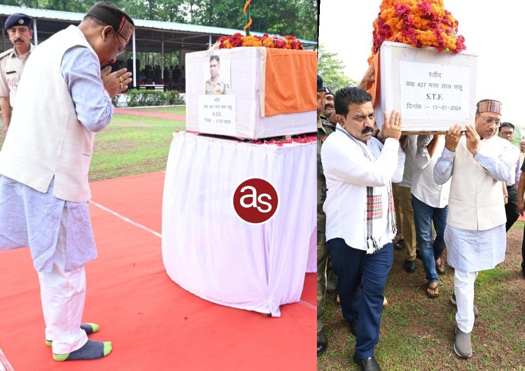 मुख्यमंत्री साय और उप मुख्यमंत्री शर्मा ने शहीद जवान के पार्थिव शरीर को कांधा देकर शहीद के निवास के लिए किया रवाना ..