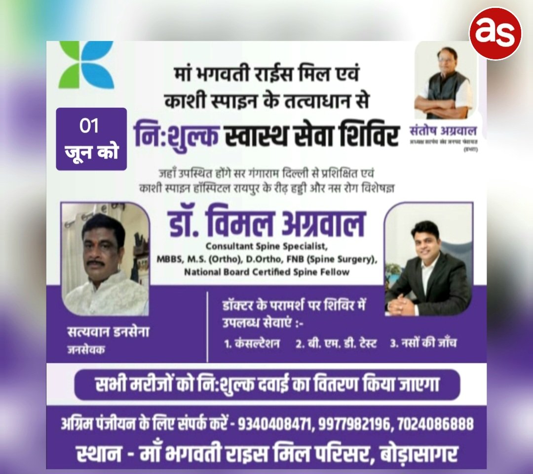 सक्ती, ग्राम बोड़ासागर स्थित मां भगवती राइस मिल परिसर में 1 जून, रविवार को नि:शुल्क स्वास्थ्य सेवा शिविर का आयोजन किया जा रहा है। यह शिविर मां भगवती राइस मिल एवं काशी स्पाइन हॉस्पिटल के संयुक्त तत्वावधान में आयोजित किया जा रहा है, जिसमें देश के ख्यातिप्राप्त रीढ़ एवं नस रोग विशेषज्ञ डॉ. विमल अग्रवाल अपनी सेवाएं देंगे।