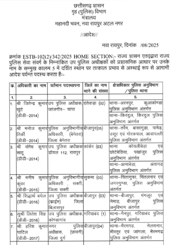 जितेन्द्र कुमार खुटे (डीडी-2014), उप पुलिस अधीक्षक जांजगीर-चांपा को दंतेवाड़ा जिले के अरनपुर और कुआकोण्डा थाना, किरंदुल पुलिस अनुविभाग में पदस्थ किया गया है।