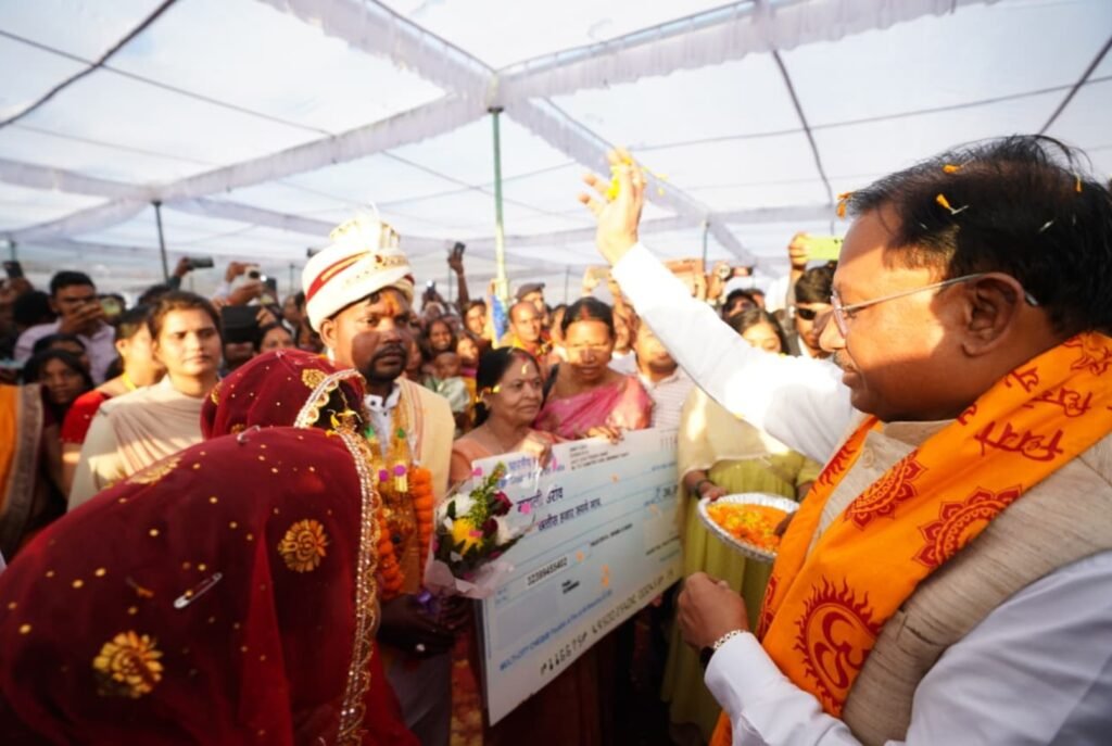 मुख्यमंत्री विष्णु देव साय ने मुख्यमंत्री कन्या विवाह योजना के अंतर्गत हसौद में परिणय-सूत्र में बंधने वाले 140 नवविवाहित जोड़ों को शुभकामनाएँ और आशीर्वाद दिया।