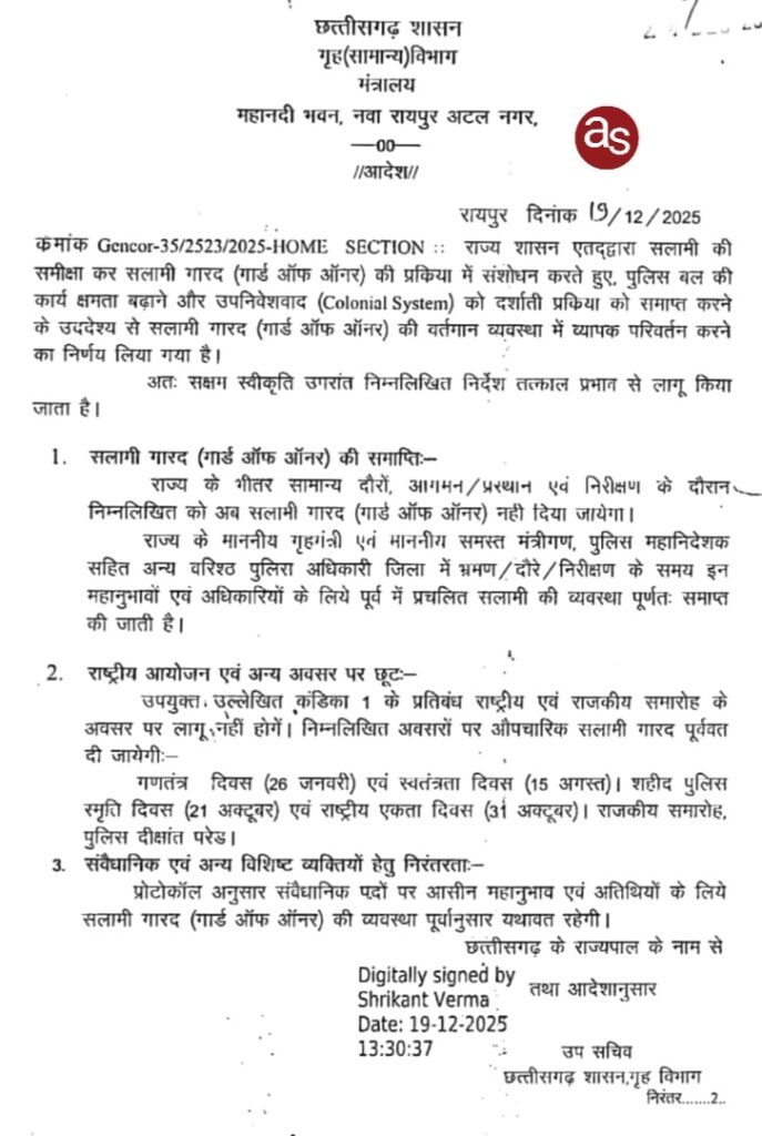 बडी खबर: छत्तीसगढ़ में मंत्रीगणों एवं पुलिस अधिकारियों को गॉर्ड ऑफ ऑनर दिए जाने की परंपरा समाप्त ..