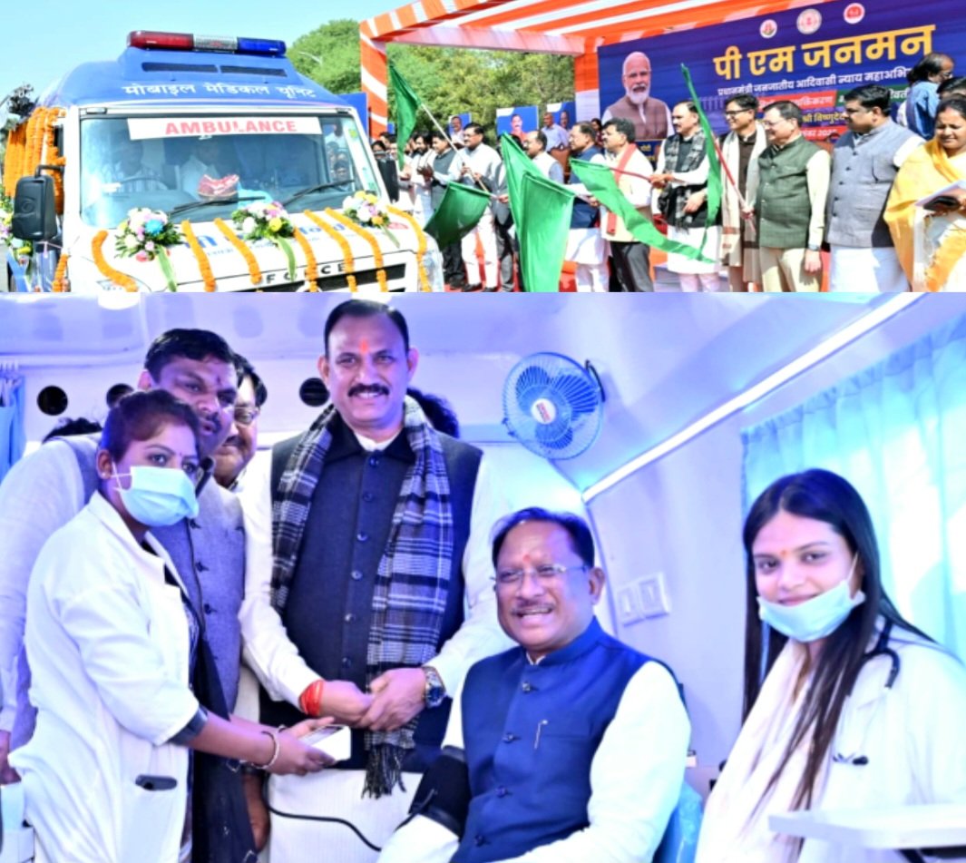 मुख्यमंत्री साय ने कहा कि छत्तीसगढ़ के लिए यह गौरव का दिन है। समाज में आर्थिक, सामाजिक, शैक्षणिक प्रत्येक दृष्टिकोण से पिछड़े लोग विशेष पिछड़ी जनजाति के लोग हैं। छत्तीसगढ़ में निवासरत 3 करोड़ की आबादी में विशेष पिछड़ी जनजाति के 2 लाख 30 हजार लोग 18 जिलों के 21 सौ बसाहटों में निवासरत हैं। यह मोबाइल मेडिकल यूनिट उनके लिए वरदान साबित होगा। इन सर्वसुविधा-संपन्न 57 मोबाइल मेडिकल यूनिट के माध्यम से यह कार्य आसान होगा। इस यूनिट में डॉक्टर, नर्स, लैब टेक्निशियन और स्थानीय वालंटियर उपस्थित होंगे। इस यूनिट में 25 तरह की जाँच सुविधाएँ तथा 106 तरह की दवाइयाँ निःशुल्क उपलब्ध होंगी।