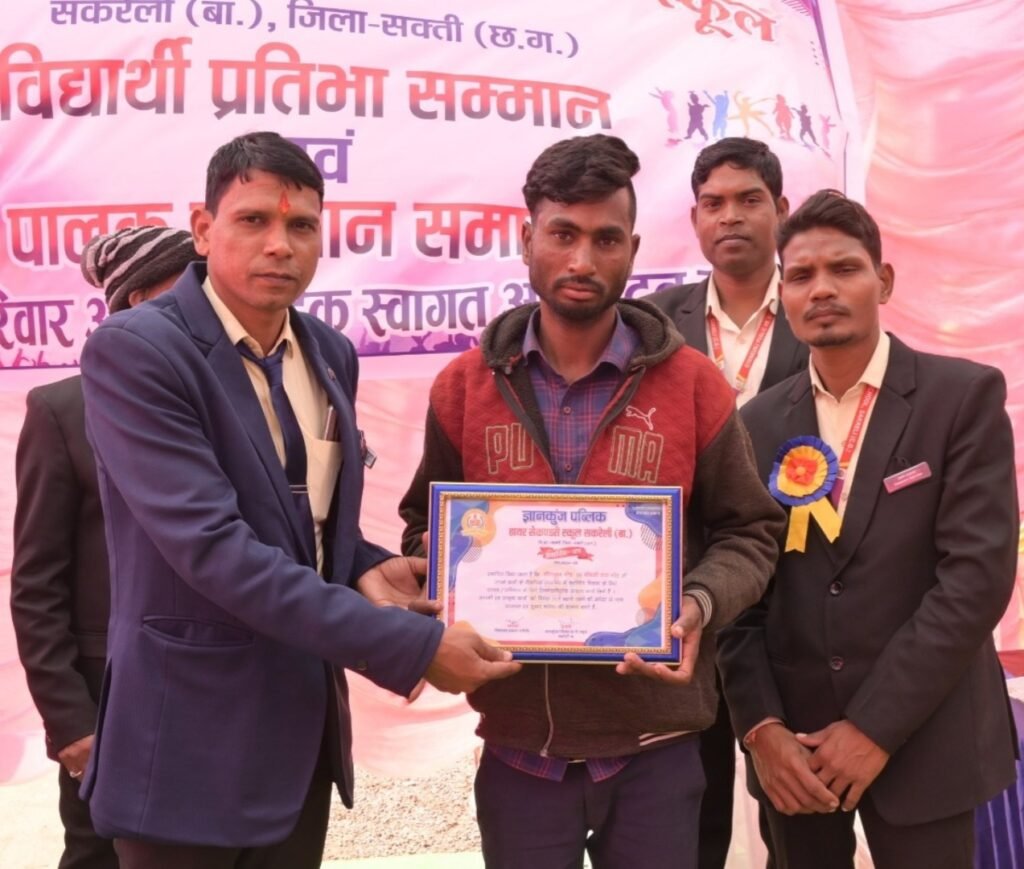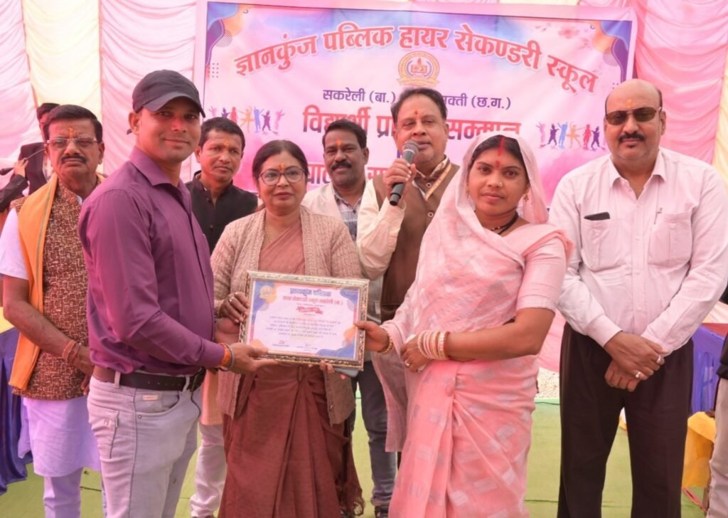 सक्ती, जिला कलेक्टर कार्यालय सक्ती से लगे ग्राम पंचायत सकरेली स्थित ज्ञानकुंज पब्लिक हायर सेकेंडरी स्कूल सकरेली (बा) में विद्यार्थी प्रतिभा सम्मान एवं पालक सम्मान समारोह हर्षोल्लास के साथ आयोजित किया गया। कार्यक्रम में शिक्षा के क्षेत्र में उत्कृष्ट प्रदर्शन करने वाले विद्यार्थियों एवं सहयोगी पालकों को सम्मानित किया गया।