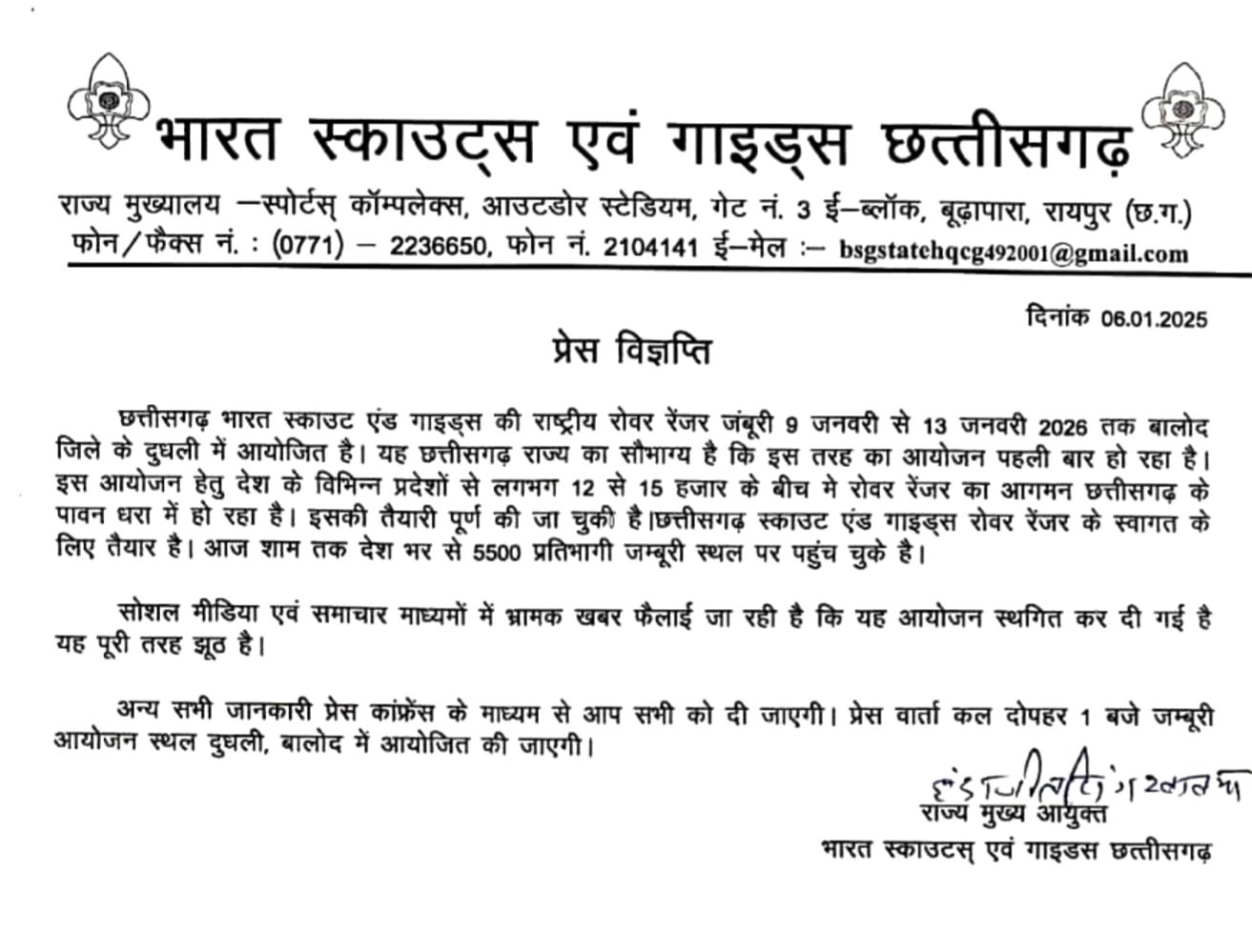 आयोजन से संबंधित अन्य विस्तृत जानकारी प्रेस कॉन्फ्रेंस के माध्यम से प्रदान की जाएगी। प्रेस वार्ता कल दोपहर 1:00 बजे जंबूरी आयोजन स्थल, दुधली, जिला बालोद (छत्तीसगढ़) में आयोजित की जाएगी।