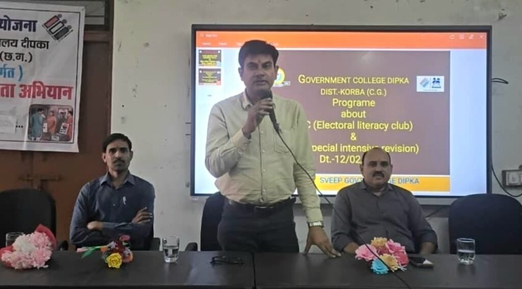 कोरबा, भारत निर्वाचन आयोग, नई दिल्ली एवं मुख्य निर्वाचन पदाधिकारी, छत्तीसगढ़ के निर्देशानुसार जिले के युवाओं को निर्वाचन प्रक्रिया के प्रति जागरूक करने हेतु दिनांक 12 फरवरी 2026 को सहायक जिला स्वीप नोडल अधिकारी सतीश प्रकाश सिंह की उपस्थिति में शासकीय महाविद्यालय दीपका में इलेक्टोरल लिटरेसी क्लब (ELC) का गठन किया गया।