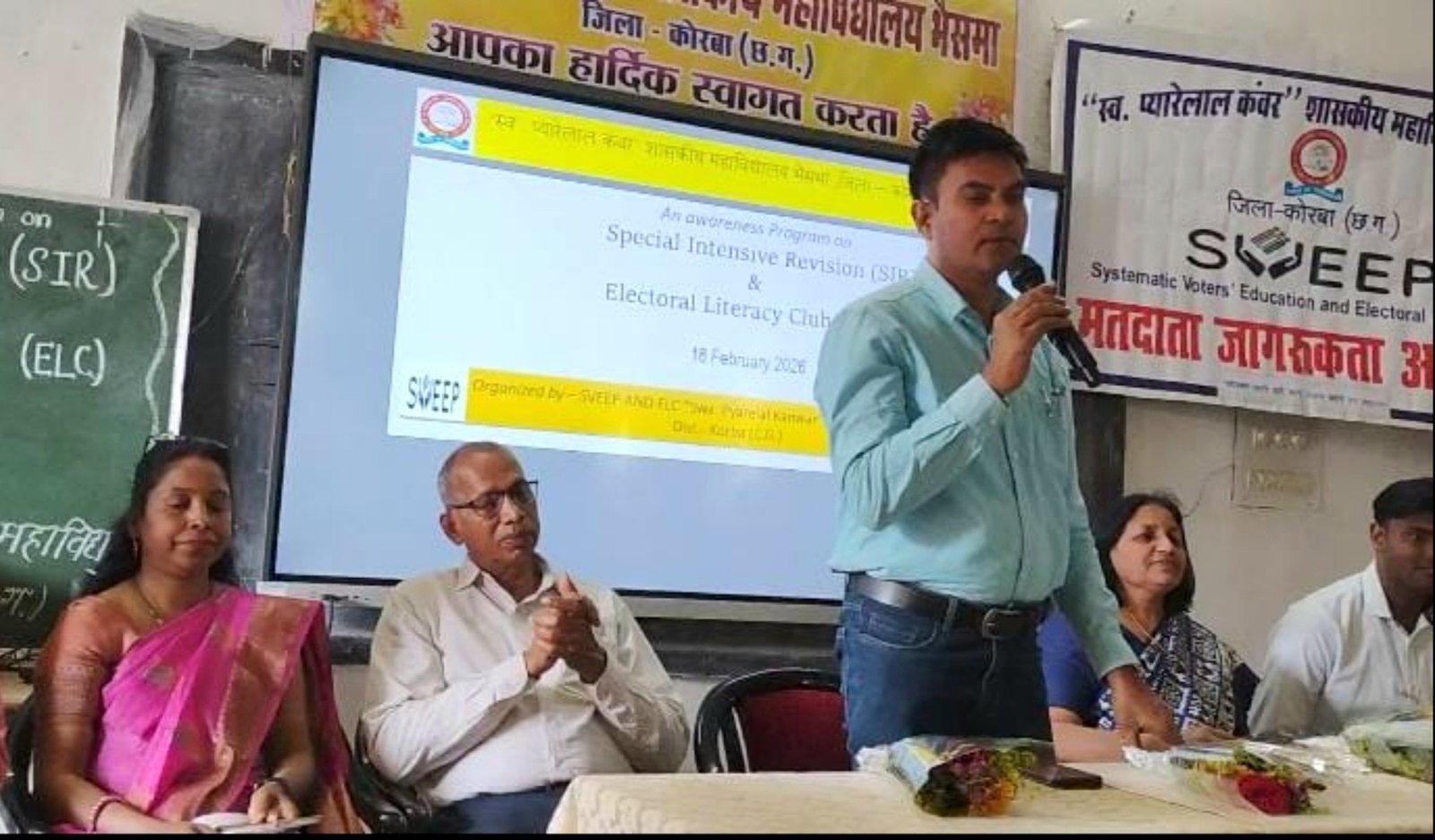 कोरबा, भारत निर्वाचन आयोग, नई दिल्ली एवं मुख्य निर्वाचन पदाधिकारी, छत्तीसगढ़ के निर्देशानुसार जिले के युवाओं को निर्वाचन प्रक्रिया के प्रति जागरूक करने हेतु दिनांक 18 फरवरी 2026 को सहायक जिला स्वीप नोडल अधिकारी सतीश प्रकाश सिंह की उपस्थिति में “स्व प्यारे लाल कंवर” शासकीय महाविद्यालय भैसमा में इलेक्टोरल लिटरेसी क्लब (ELC) का गठन किया गया।