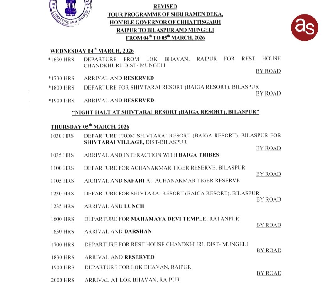बिलासपुर, राज्यपाल रमेन डेका 4 एवं 5 मार्च 2026 को बिलासपुर एवं मुंगेली जिले के प्रवास पर रहेंगे। निर्धारित कार्यक्रम...
