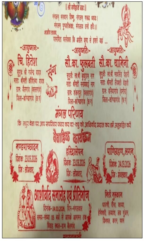 रायपुर, छत्तीसगढ़ के कोंडागांव जिले के फरसगांव ब्लॉक अंतर्गत बैलगांव में 24 मार्च को एक अनोखी शादी ने सबका ध्यान अपनी ओर खींच लिया। इस विवाह में एक ही दूल्हे ने दो दुल्हनों के साथ एक ही मंडप में सात फेरे लिए, जो इलाके में चर्चा का विषय बना हुआ है।