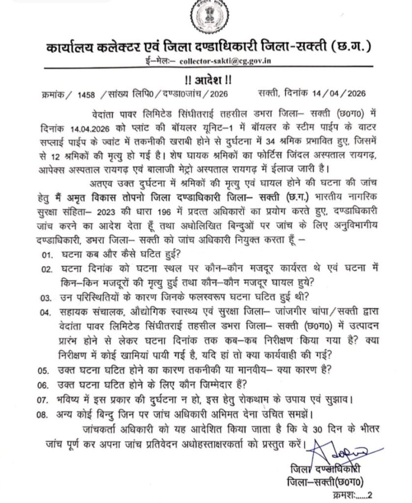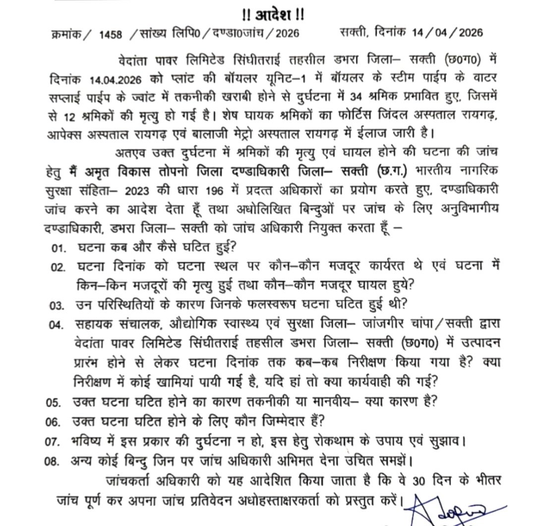 सक्ती में भीषण औद्योगिक हादसा: वेदांता प्लांट हादसे में 12 मजदूरों की मौत, 34 प्रभावित — कलेक्टर ने बिठाई मजिस्ट्रियल जांच ..