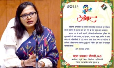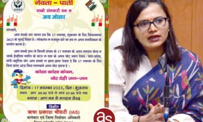 कलेक्टर एवं जिला निर्वाचन अधिकारी सुश्री ऋचा प्रकाश चौधरी ने भेजा नेवता , 17 नवम्बर को चुनई तिहार में शत प्रतिशत मतदान की अपील .. जांजगीर-चांपा,...