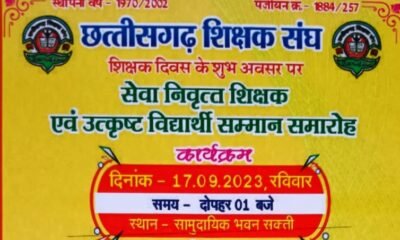 सक्ती, छत्तीसगढ़ शिक्षक संघ द्वारा शिक्षक दिवस के पावन अवसर पर सम्मानित किए जाने वाले प्रबुद्ध शिक्षकों के सम्मान आधारित सेवानिवृत्त शिक्षक एवं उत्कृष्ट विद्यार्थी सम्मान...