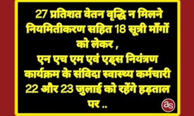 घोषित 27 प्रतिशत वेतन वृद्धि न मिलने नियमितीकरण सहित 18 सूत्री माँगों के लिए 22 और 23 जुलाई को रहेंगे हड़ताल पर, बिगड़ सकती है प्रदेश...