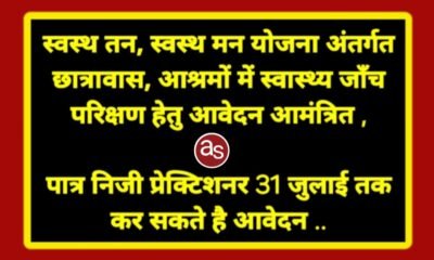 पात्र निजी प्रेक्टिशनर 31 जुलाई तक कर सकते है आवेदन .. सक्ती, सहायक आयुक्त आदिवासी विकास विभाग सक्ती दुष्यंत रायस्त से प्राप्त जानकारी अनुसार अनुसुचित जाति...