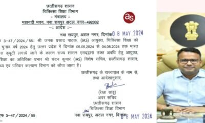 रायपुर, छत्तीसगढ़ शासन ने लोक स्वास्थ्य एवं परिवार कल्याण विभाग के विशेष सचिव IAS चंदन कुमार को आयुक्त, चिकित्सा शिक्षा का अतिरिक्त प्रभार सौंपा गया है।...
