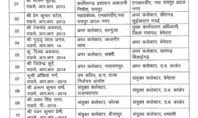 रायपुर , आज 1 मार्च को राज्य प्रशासनिक सेवा के 13 अफसरों की एक और तबादला सूची जारी की गई है। सूची इस प्रकार है –